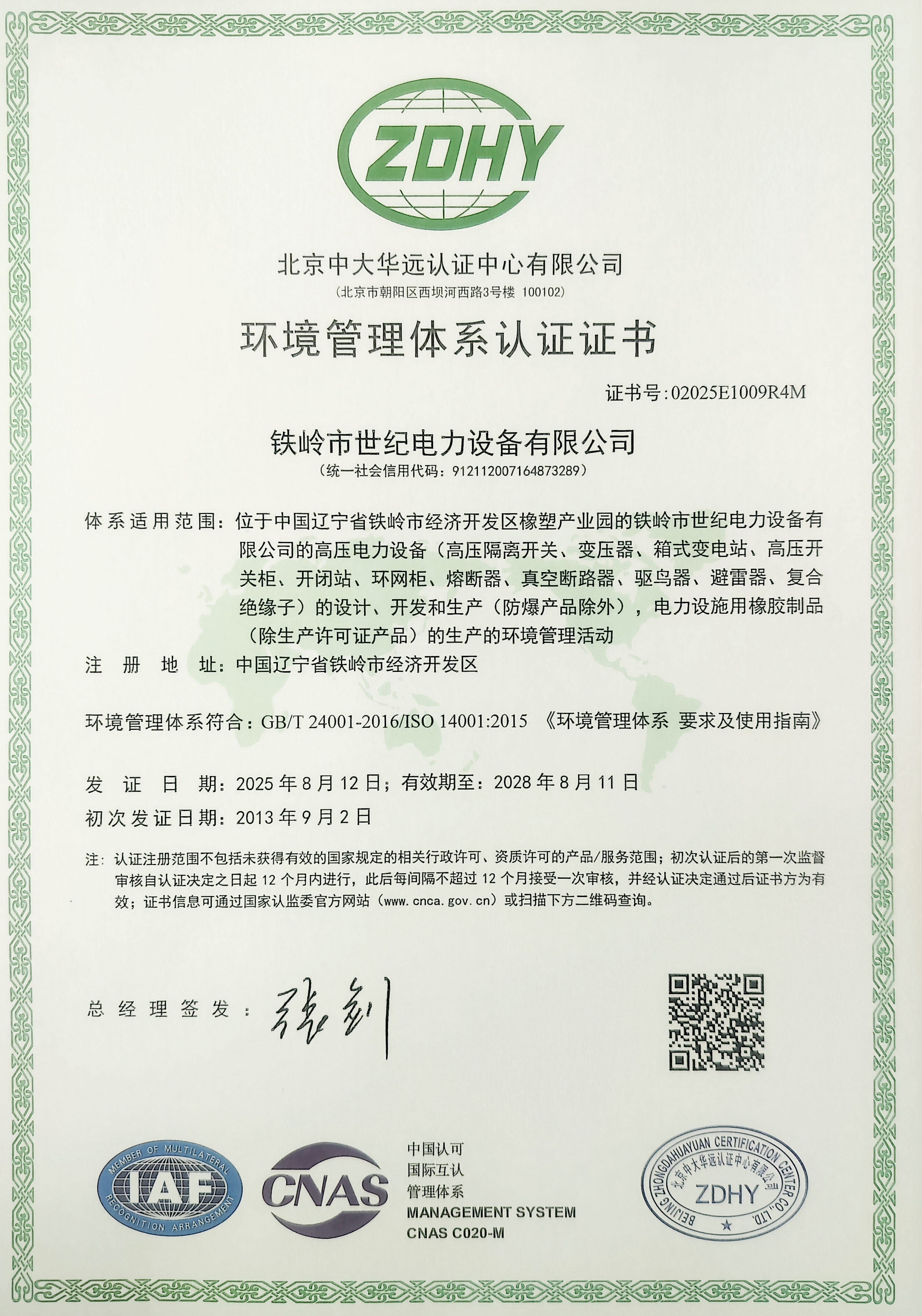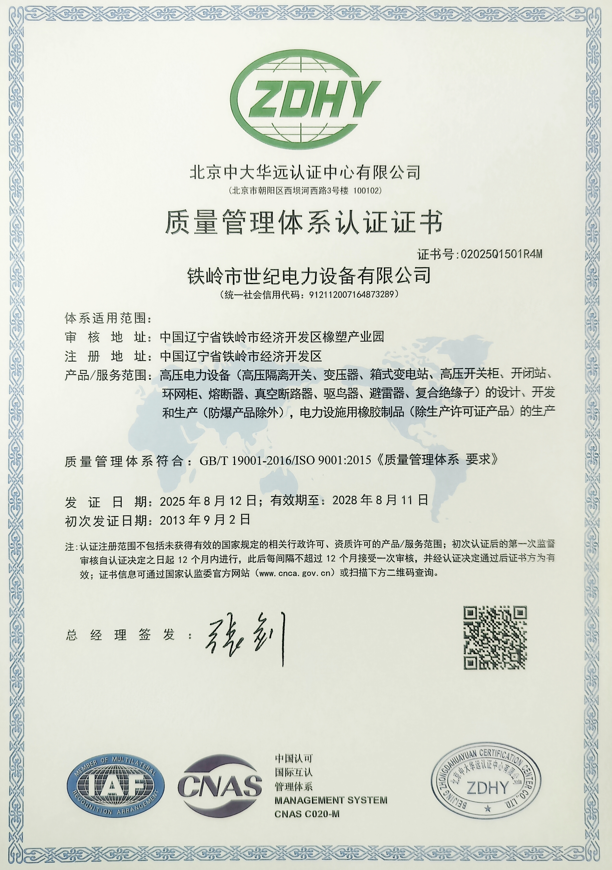 鐵嶺市世紀(jì)電力設(shè)備有限公司是集科研開發(fā)、生產(chǎn)制造、用戶服務(wù)于一體的國家高新技術(shù)企業(yè),始建于1999年,位于鐵嶺經(jīng)濟開發(fā)區(qū),占地面積5萬余平方米,建筑面積2萬余平方米。主要從事國家電網(wǎng)配套戶外高低壓隔離開關(guān)、電力電纜、變壓器成套裝置、高低壓開關(guān)柜、箱式變電站、絕緣子等產(chǎn)品的研發(fā)、生產(chǎn)和銷售。公司現(xiàn)有國家發(fā)明專利6項、實用新型專利9項,公司通過了ISO9001國際質(zhì)量管理體系認(rèn)證、ISO14001環(huán)境管理體系認(rèn)證和ISO 45001職業(yè)健康安全體系認(rèn)證。